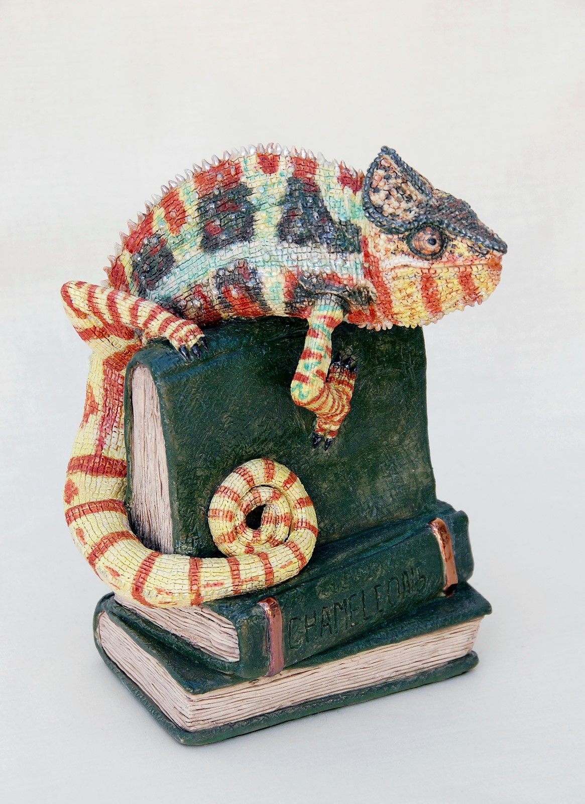 Panther Chameleon on three books - stoneware - 8.5insH x 5.5W