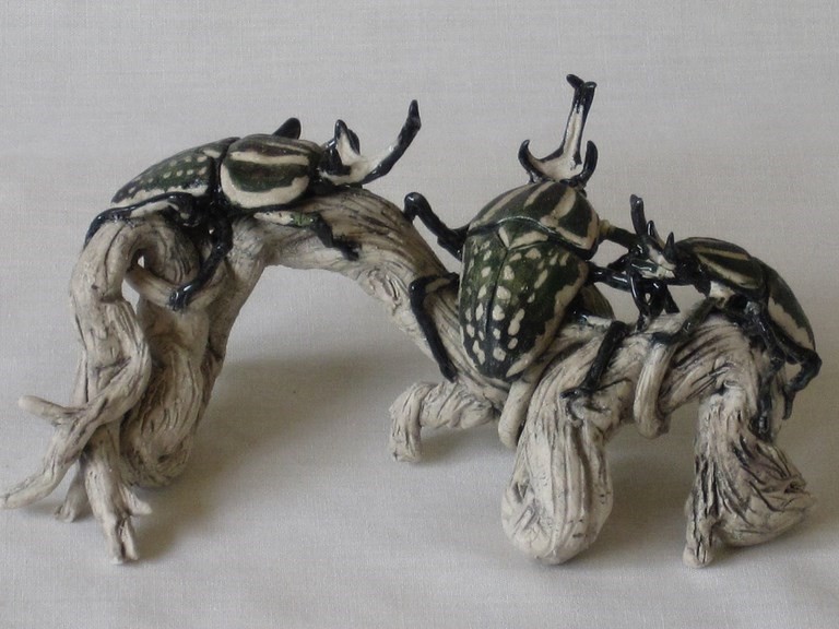 Three green Goliathine beetles - stoneware - 15 x 7cms